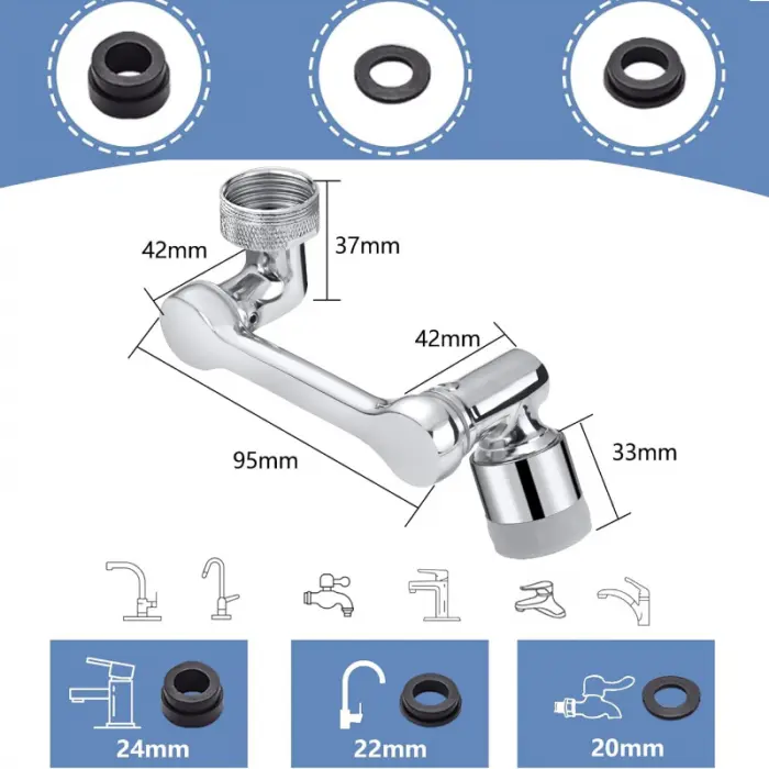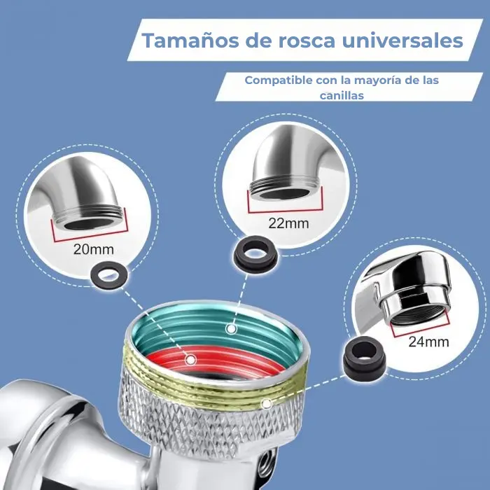 Incluye aireador, adaptadores de rosca interna y externa, y una extensión que se ajusta a la mayoría de los picos de canilla del mercado. Su instalación es simple y sin herramientas: solo enroscá, ajustá y listo.
