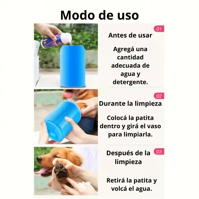 Fácil de usar: solo agrega agua y un poco de desinfectante de manos, inserta la pata, seca y repite con las demás.
