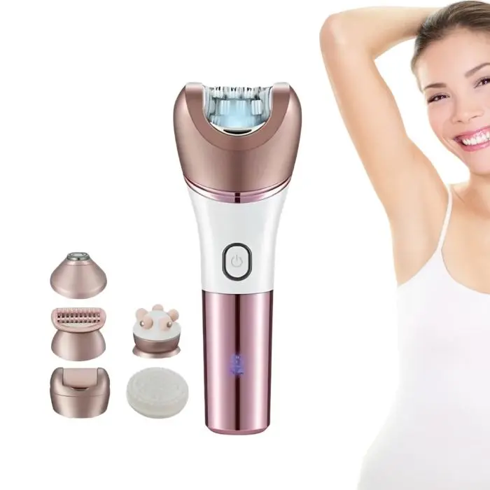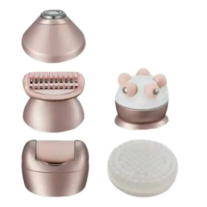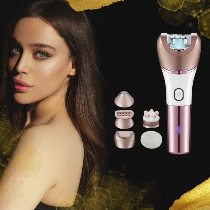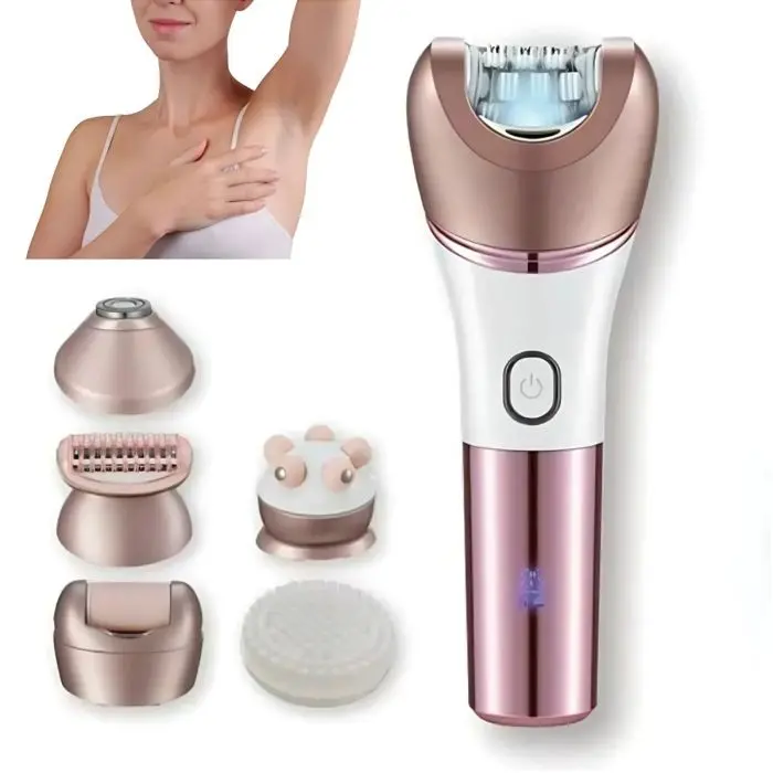 🩵 Multifunción 6 en 1 – incluye cabezales para depilación, rasurado, recorte, masaje facial, exfoliación/removedor de callos y masajeador de alta frecuencia.