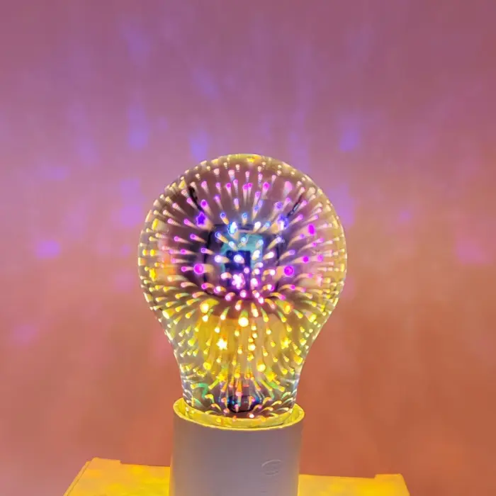 Transformá tu ambiente con esta bombilla LED de diseño tubular retro ST19, que al encenderse proyecta un efecto tridimensional de fuegos artificiales lleno de brillo y color. Ideal para dar un toque especial a fiestas, terrazas, oficinas, hogares o eventos, su iluminación colorida aporta calidez y alegría a cualquier espacio.