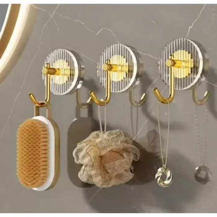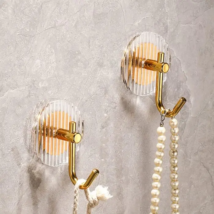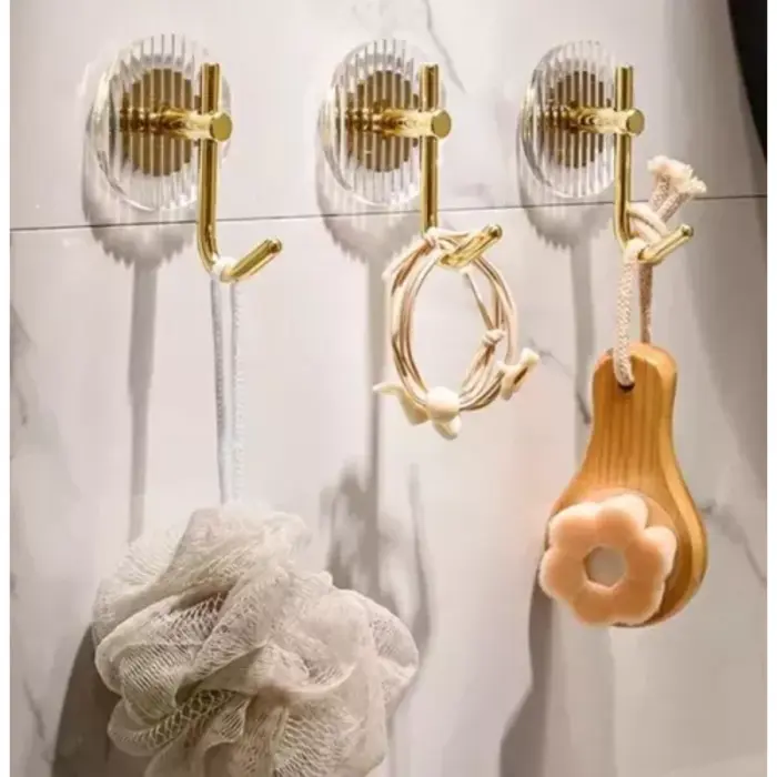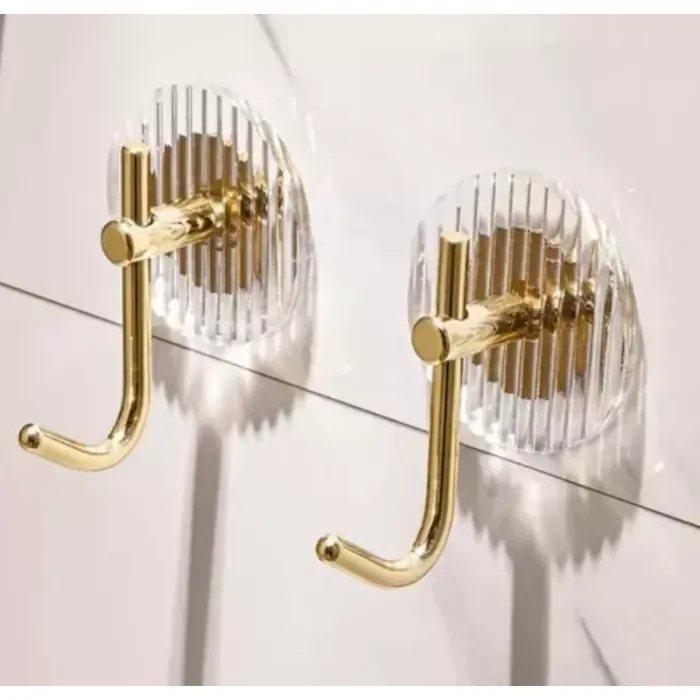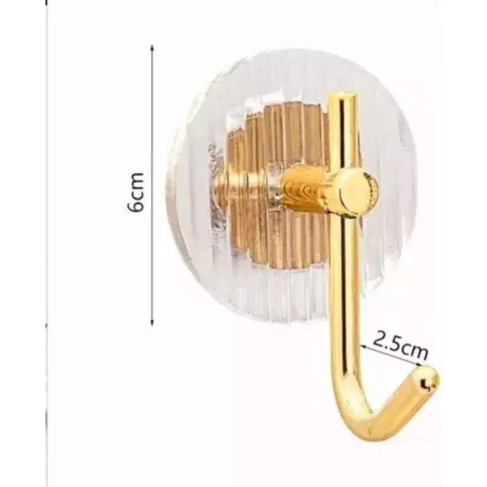 Este gancho adhesivo combina diseño elegante y practicidad, perfecto para mantener el orden en tu hogar u oficina sin necesidad de hacer agujeros. Fabricado en acrílico resistente con acabado dorado, se adhiere firmemente a superficies lisas como vidrio, metal, azulejos, espejos o acrílico, soportando el uso diario con durabilidad.