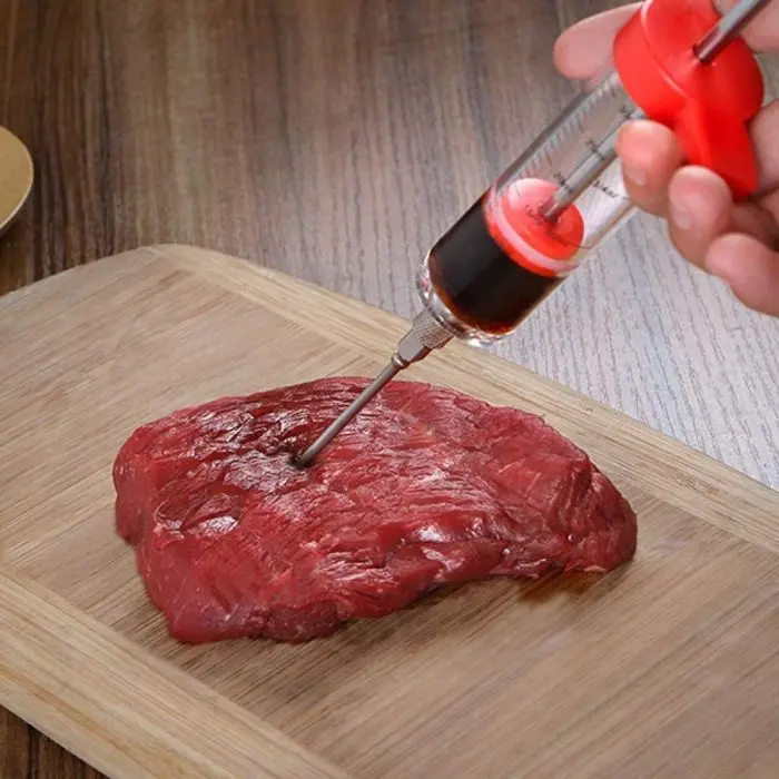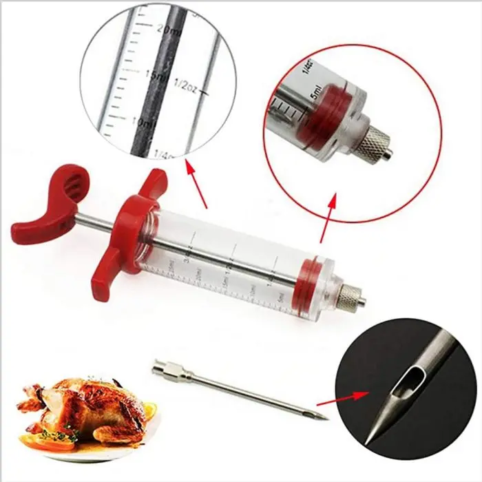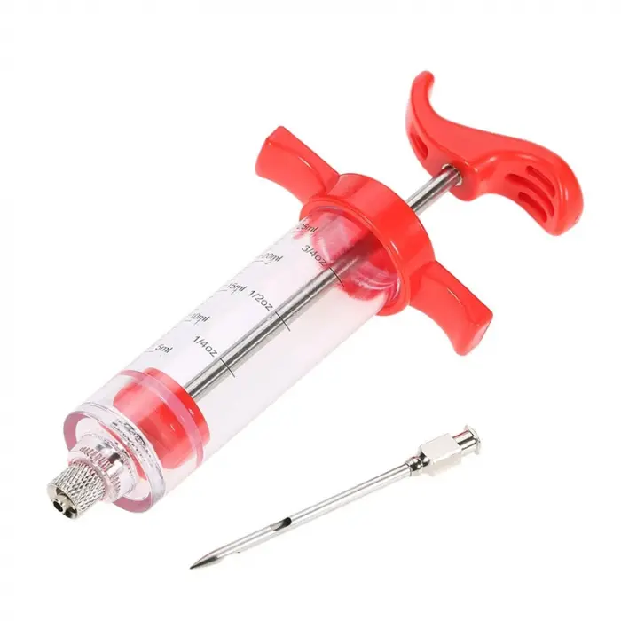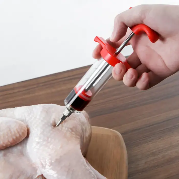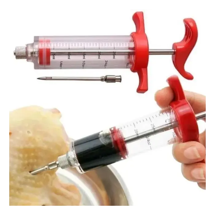 Esta jeringa para adobar es una herramienta indispensable para quienes disfrutan cocinar con sabor. Su aguja metálica resistente permite inyectar líquidos o marinadas directamente en el interior de carnes, pollos o pescados, garantizando una cocción más uniforme y un resultado lleno de sabor.