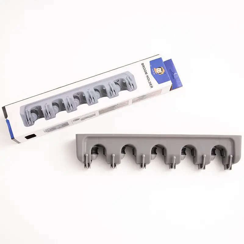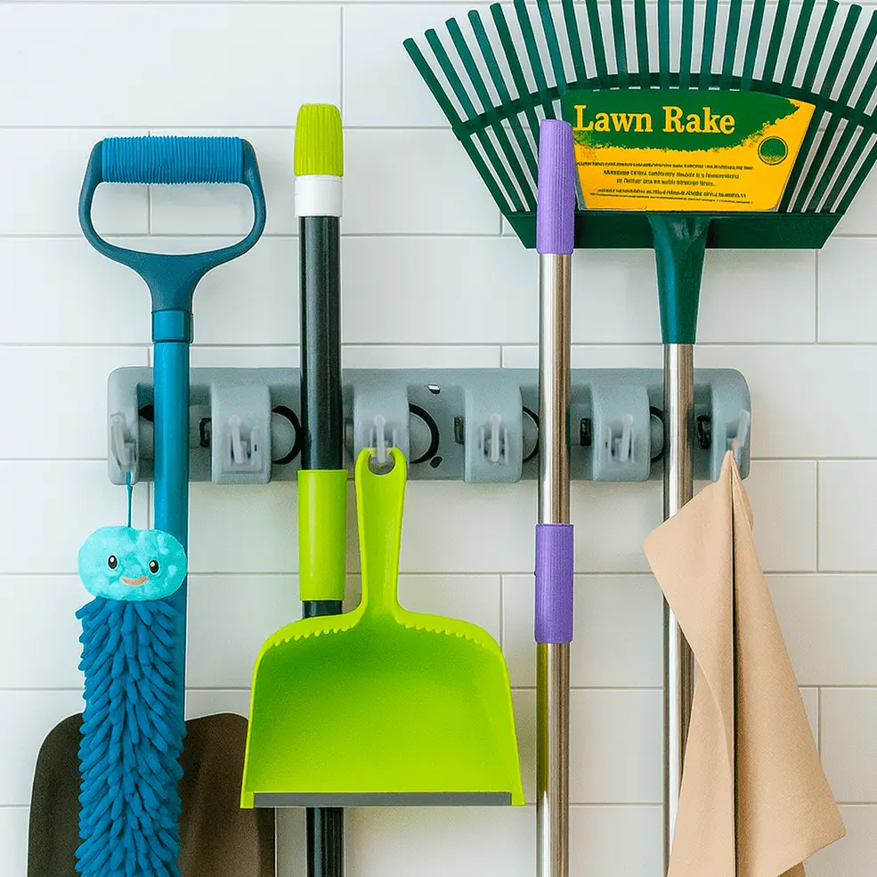 Diseñado en color gris, ofrece un estilo neutro y funcional que se integra fácilmente con distintos entornos. Sus ganchos adicionales aportan extra espacio para colgar accesorios como trapos, plumeros o escobillas, manteniendo todo en un mismo lugar con total accesibilidad.