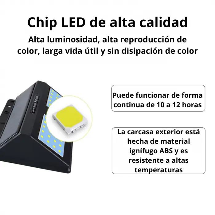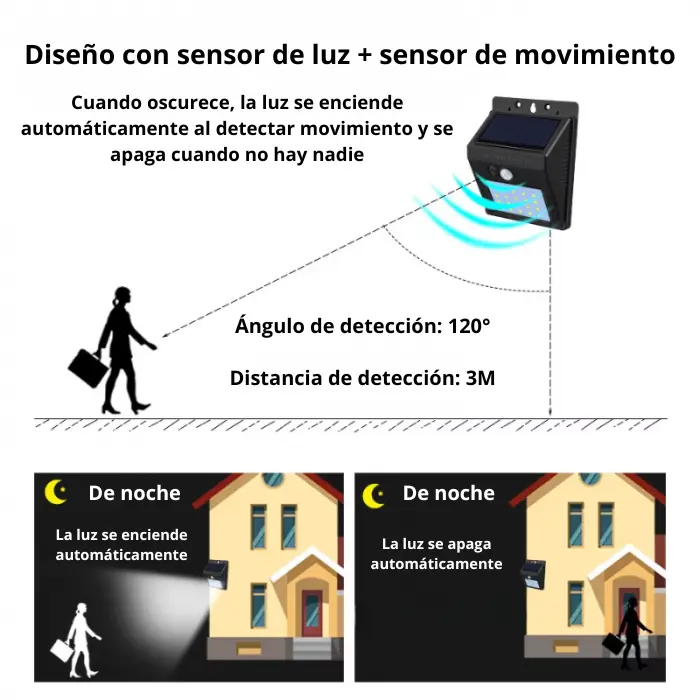 Su sensor de movimiento de amplio ángulo (120°) detecta la presencia en la oscuridad y activa la iluminación por 10 segundos, brindando seguridad y practicidad en patios, jardines, entradas o pasillos exteriores.