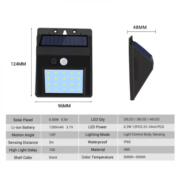 Diseñado para brindar iluminación automática sin consumo eléctrico, este reflector combina panel solar de alta eficiencia (0,55W, 17%) con una batería de iones de litio de 1200 mAh, ofreciendo luz potente y confiable durante toda la noche.