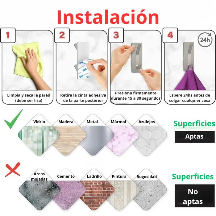 Su sistema autoadhesivo de doble cara ofrece una sujeción firme capaz de soportar hasta 6 kg por gancho. La instalación es simple y rápida: solo adherir, presionar y dejar reposar durante 24 horas antes de colgar objetos para asegurar su máxima efectividad.